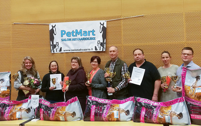 ![]() Ryhmäkuvassa 7.3.2019 vuosikokouksessa palkittujen vuoden 2018 parhaiden koirien omistajia |